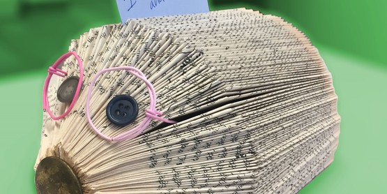 February 23rd-Paper Hedgehog Photo-Holder-You'll need a paperback book, 2-3 dark colored buttons and glue